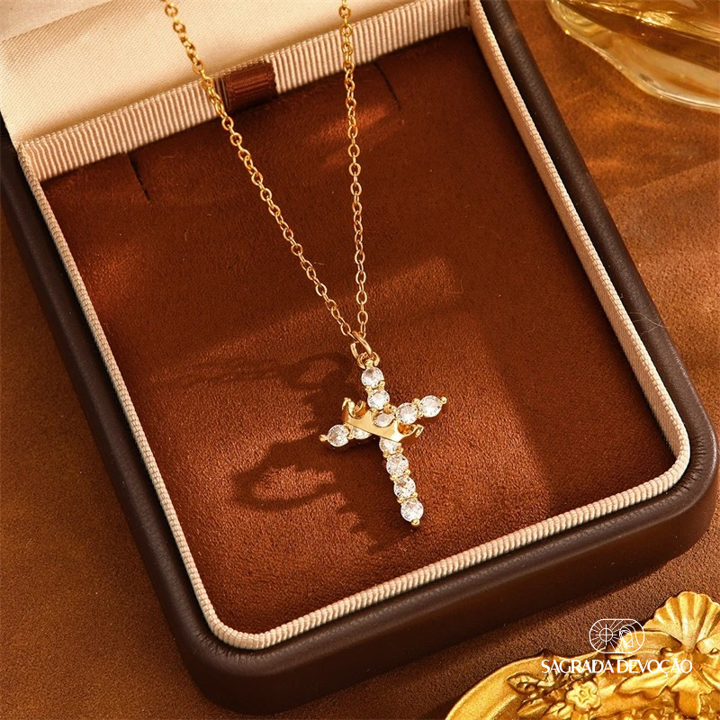 [COMPRE 1 LEVE 2] Colar Cruz de Cristo + Coroa Sagrada – Zircônia Premium & Ouro 14K