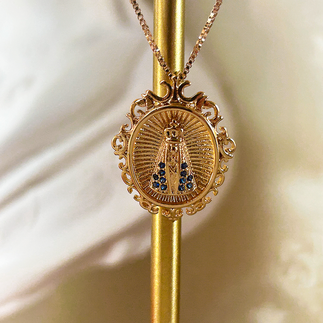 O design em moldura do Colar Retrato representa um verdadeiro quadro sagrado um retrato de Nossa Senhora sempre junto ao seu coração, guiando e abençoando seu caminho.